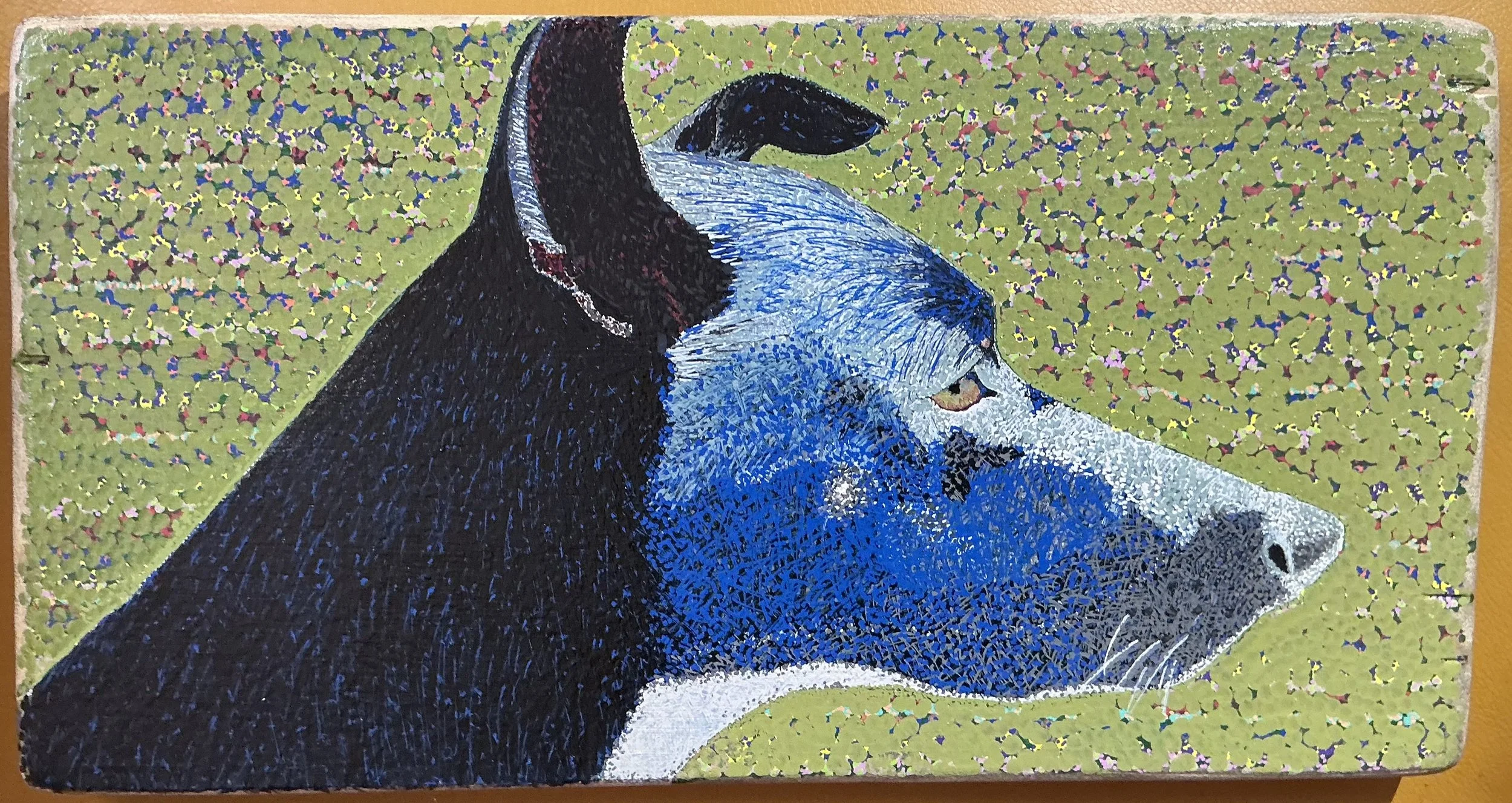 Waiting for Heidi (Caddo) 2025 • oil & acrylic on scrap wood • 7" x 14" • NFS (Commission)